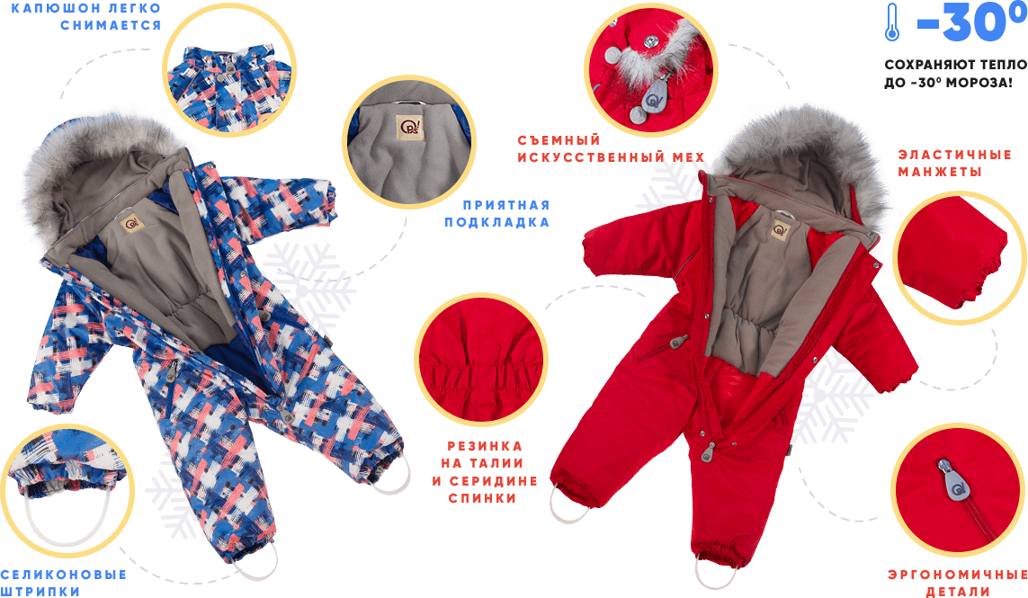 В нашем интернет магазине представлена коллекция комбинезонов Oops. First Winter. Слитные комбинезоны популярны как для малышей, так и для детей постарше. Многие эксперты уверены, что в слитном комбинезоне теплее, чем в раздельной, ведь тепло спокойно циркулирует внутри модели. Модели имеют центральную застежку до паха, закрывающуюся специальной ветрозащитной планкой.
